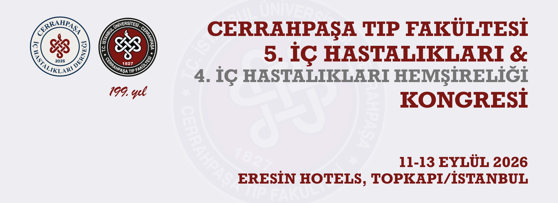 “Cerrahpaşa Tıp Fakültesi 5. İç Hastalıkları ve 4. İç Hastalıkları Hemşireliği Kongresi” Cerrahpaşa İç Hastalıkları Derneği tarafından 11-13 Eylül 2026 tarihleri arasında Eresin Hotels, Topkapı/İstanbul’da gerçekleştirilecektir.
